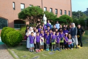 주일학교 성지순례 출발전 신부님과 함께 사진촬영